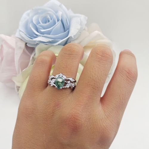 OMRANII Two Piece Pear Teardrop Natural Green Moss Agate Leaf Infinity Twisted Curved Band Bridal Set Vintage Style Wedding Engagement Ring 925 Sterliing Silver 5