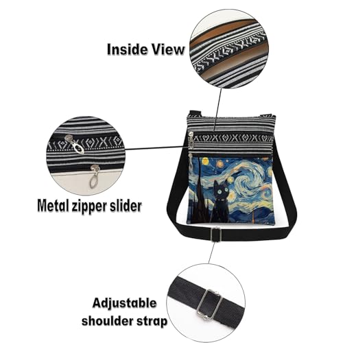Starry Cat Adjustable Shoulder Strap Crossbody Bag Van Gogh's oil painting with Black Cat Print for Cat Lover Daily Use Messenger Bag Birthday Gift Christmas Present​​ for Friend Sister 7