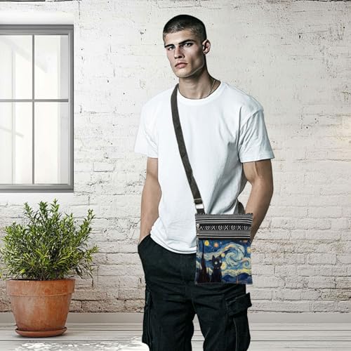 Starry Cat Adjustable Shoulder Strap Crossbody Bag Van Gogh's oil painting with Black Cat Print for Cat Lover Daily Use Messenger Bag Birthday Gift Christmas Present​​ for Friend Sister 1