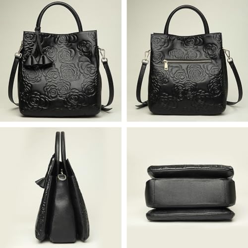 Womens Genuine Leather Handbags large Trendy Shoulder Tote Three-layer Crossbody Purses Flower Print Satchel 3
