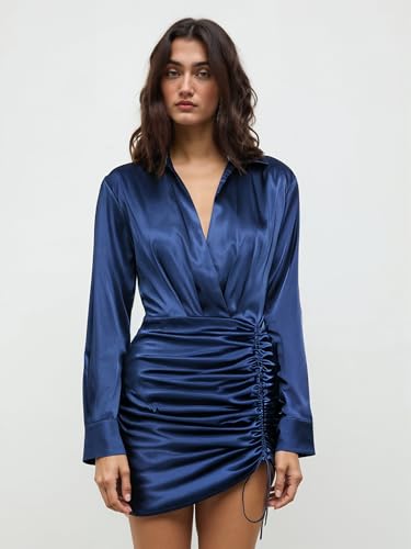 CIDER Satin Women Mini Shirt Dress Long Sleeve Collar Drawstring Waist Party Elegant Short Dress 1