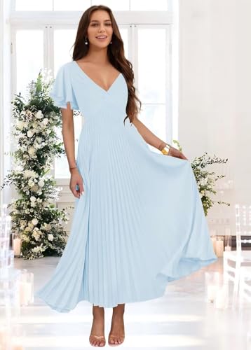 HOT ! Miao Duo Women's Pleated Silk Satin Wedding Guest Dresses Elegant Short Sleeves Maxi Formal Dresses YZTS289