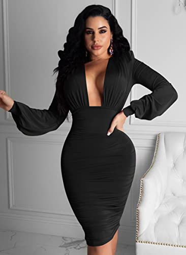 GOBLES Women's Sexy Deep V Neck Long Sleeve Ruched Bodycon Midi Party Dress 6