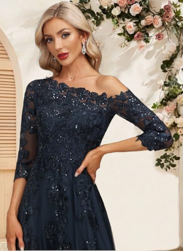 More information about Long Sleeve Mother of The Bride Dresses for Women A Line Lace Appliqued Formal Dress One Shoulder Tulle Evening Gown