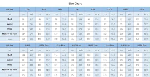 • Customization: We offer a free customization service. Please select the size closest to your own size and tell us your detailed measurements(in inches) of bust, waist, hips, shoulder to floor, height and heels height
