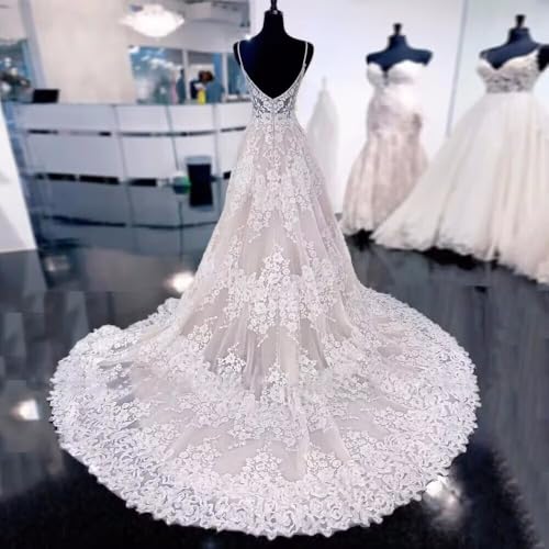 • 【Exquisite Design】The lace wedding dress has a exquisite design with trendy spaghetti straps,elegant a line shape,classic zipper closure and stylish v neck,unique side slit emblishment and lightweight,skin-friendly,breathable lace fabric, sweep train,built-in bra,fully lined,flowy hem,with finely tailored lines along the curves of the bust waist and hips,show your charming.