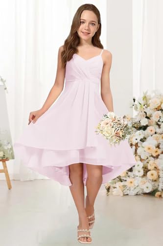 • Elegant Hi-Lo Design with Sweet Details: Crafted from lightweight, flowy chiffon, this short junior bridesmaid dress features dainty spaghetti straps and charming ruffle accents. The hi-lo hem adds a playful twist—shorter in front for easy movement, longer in back for a touch of elegance—perfect for young girls to twirl and shine.