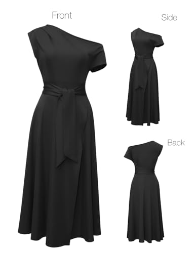 • Features: Asymmetric neckline, Left off-shoulder, Right sleeveless with ruched details, High waist, Detachable wide belt included, Front side slit, Two side Pockets, Super comfortable stretch fabric