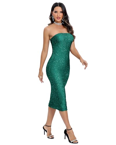 Capuffy Women Strapless Sequin Fantasy Midi Dress Sleeveless Tube Bodycon Club Dress Sparkly Glitter Cocktail Party Dress 77 5