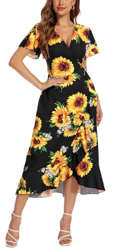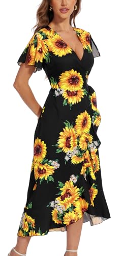 • 【Design】:This summer sunflower print short sleeve maxi dress is designed with a wrap around high waist, the silhouette and split cleverly trim small thick legs, wide hips and small belly, making you look slimmer. The curvature of the skirt and the ruffle hem add to the femininity of the dress, and the waist tie makes you look more feminine and charming.