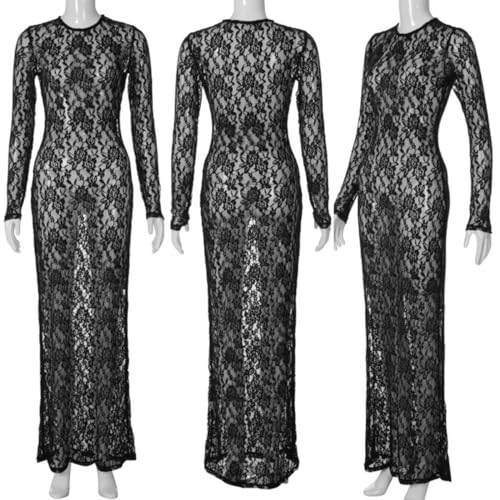 HOT ! Suillty Women's Elegant Floral Lace Long Sleeve Maxi Dress MeshSee Through Bodycon Y2K Party Club Outfit