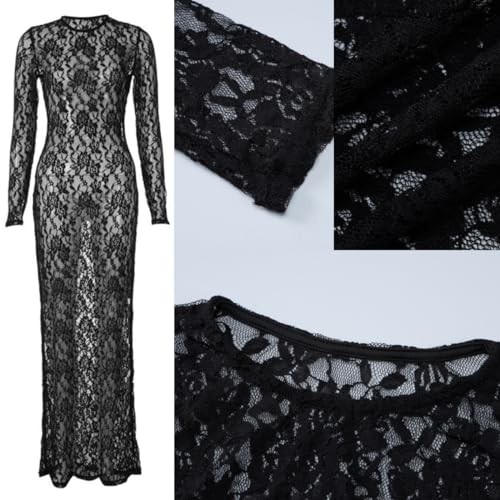Suillty Women's Elegant Floral Lace Long Sleeve Maxi Dress MeshSee Through Bodycon Y2K Party Club Outfit 7