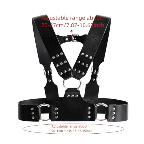 • Black chest harness is one size,which details as picture shown, u can adjust the length of the belt according to your body shape,suitable for most men.