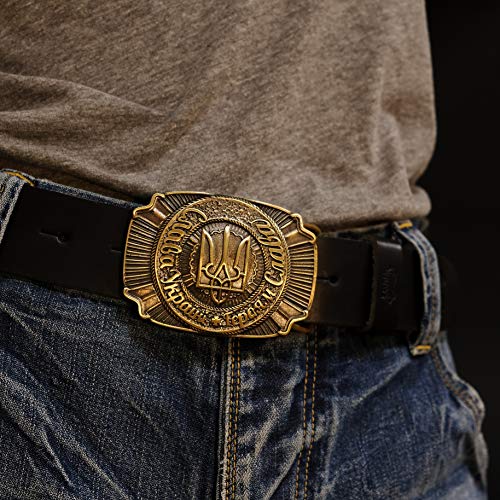 HOT ! Leather belt with handmade Ukrainian trident solid brass buckle "Glory to Ukraine! Glory to the heroes! "