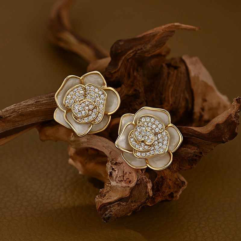 Hot-selling S925 silver needle retro enamel oil-drop earrings with high-end cubic zirconia camellia stud earrings on Douyin Live 2