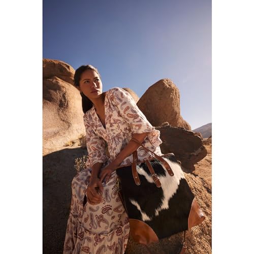 • BEAUTIFUL SHOULDER BAG - This alluring bag features beautiful of hair-on hide with beautiful accents of warm caramel leather. The reverse is a cloud gray woven canvas, with zippered pocket.