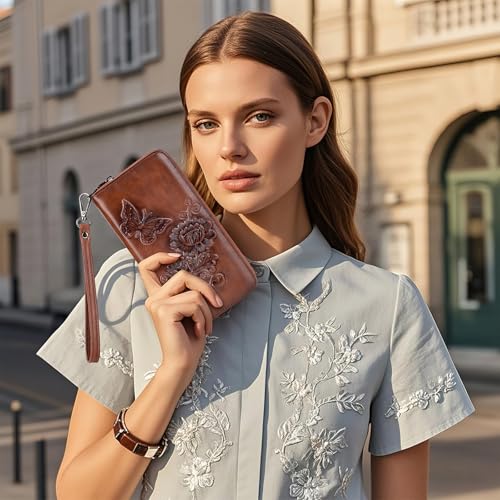 • 【Exclusively Licensed Design】Copyrighted floral artwork, licensed to VIMUTI only.This leather wallets for women features elegant embossed flower patterns and luxurious waxed oil leather,Vegan-friendly and has no bad smell,Develops a unique patina over time,the embossed floral design make long womens wallets look more unique,outstanding,timeless elegance,Perfect for everyday use or travel, dating, shopping, etc.