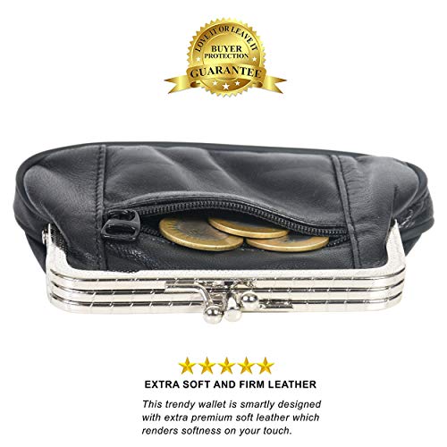 Women's Leather Metal Frame Double Clasp Zipper Coin Purse 5 1/4" x 3 1/4" (Black) 5