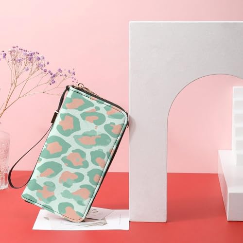 Pastel Mint Green Leopard Print Peach PU Leather Clutch Long Bifold Wallet, Coin Purse Credit Pass Case, Durable Card-Holder Money Storage for Women Men 1