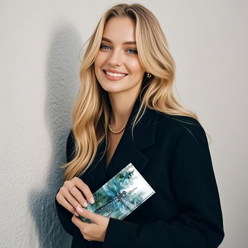 HOT ! Slim Thin RFID Blocking Credit Card Wallets, Long Wallet for Women, Bifold PU Leather Credit Card Holder Cute Cash Clutch Long Billfold, Button protection, Dragonfly and Forest