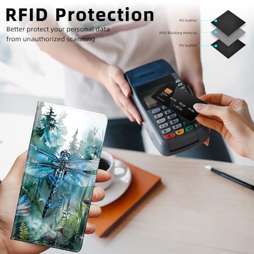 Slim Thin RFID Blocking Credit Card Wallets, Long Wallet for Women, Bifold PU Leather Credit Card Holder Cute Cash Clutch Long Billfold, Button protection, Dragonfly and Forest 3