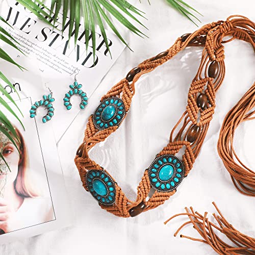 2 Pcs Turquoise Braid Waist Belt Set with Beaded Dangle Earrings Bohemian Rope Belt with Tassel Western Jewelry for Women 6