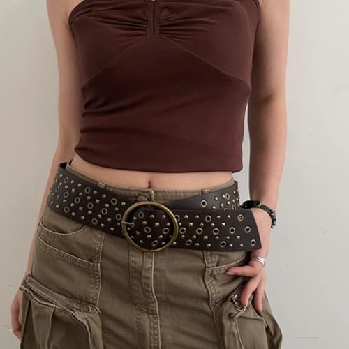 More information about Punk Rock Women Man Y2K Vintage Chic Metal Round Buckle Waistband Wide Waist Strap Rivet Belt Trouser Dress Belts(coffee)