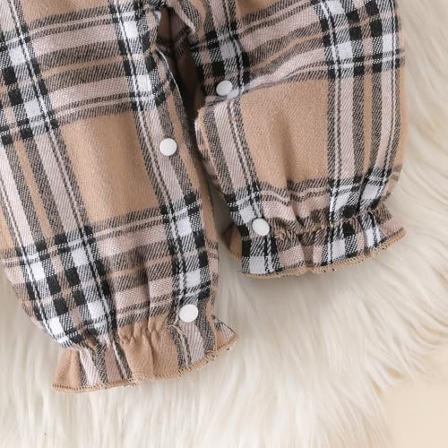 • Unique Sweet Design:This newborn girl clothes feature a ribbed design on the top with a round neckline, made from soft fabric that allows the baby to move freely. The baby girl clothes are equipped with snap buttons at the crotch for easy and quick diaper changes. The suspender pants are designed with cute ruffled shoulder straps, adding a playful touch. The delicate plaid pattern and the little bow on the front of the pants add extra charm. The matching bow headband adds a hint of playfulness.