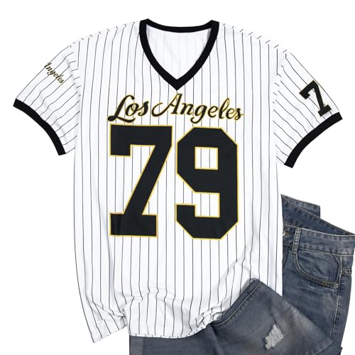• Features: Oversized jersey features striped design, "Los Angelas" letter print, number graphic jersey tee, v neck, drop shoulder, short sleeves, color block, oversized fit and trendy y2k style. Our summer casual tee shirt is suitable for any body types.