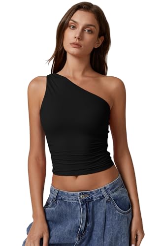 HOT ! QINSEN Women's One Shoulder Tank Tops Double Lined Sleeveless Slim Fit Cropped Tee Shirt Y2k Tops