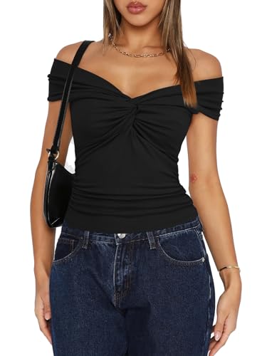 HOT ! Darong Women Summer Twist Knot Front Off The Shoulder Tank Tops Cap Sleeve Going Out Shirts Slim Fitted Y2K Outfits