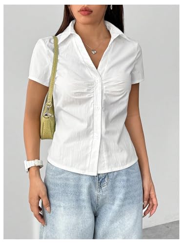 HOT ! SweatyRocks Women's Ruched Button Up Blouses Collar V Neck Short Sleeve Work Shirts