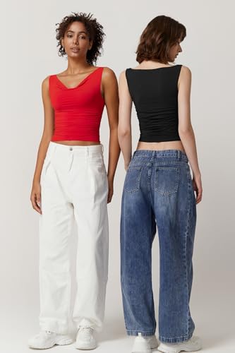 HOT ! QINSEN Women's Cowl Neck Top Sleeveless Ruched Double Lined Crop Top Y2k T Shirts