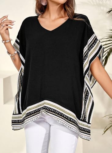 • FEATURES: This Batwing top for women features a V-neck design, oversized style, bat wing short sleeves, side slits, and wide striped color-blocking trims on the cuffs and hem, which is elegant and fashionable, cute and charming.