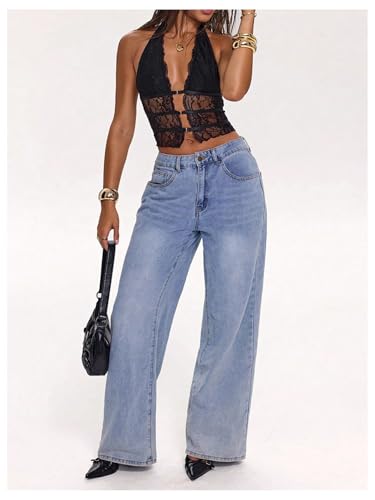 More information about SOLY HUX Women's Lace Sheer Hollow Out Y2k Halter Top Backless Deep V Neck Crop Vest Shirts