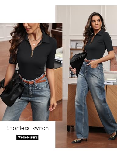 Women's Half Sleeve Top 2025 Summer Elegant V Neck Zipper Collared Work Shirts Slim Fitted Dressy Blouses 4