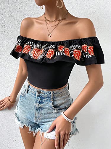 MakeMeChic Women's Floral Embroidered Off Shoulder Ruffle Trim Crop Top Blouse Shirt 6