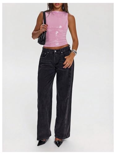 HOT ! MakeMeChic Women's Sequin Sparkly Tank Crew Neck Sleeveless Party Crop Tops Clubwear