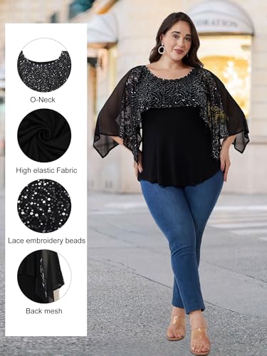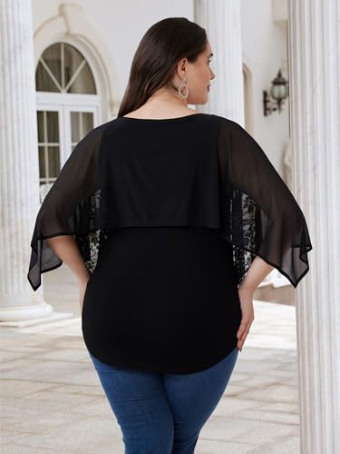 • ✨【Feature】Womens plus size tops with trendy sequins design, crew neck, half sleeves. Mesh lace detail at the cloak sleeves, rhinestone at the crewneck show off your glamor while still staying classy and elegant.