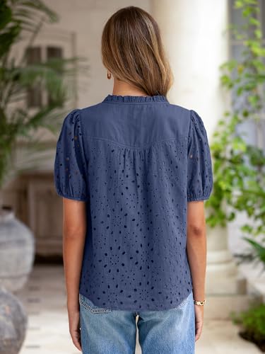 Glamaker Womens Summer Tops Blouse 2025 Casual Eyelet Embroidered Short Puff Sleeve Lace Hollow Out Button Dressy Shirts 6