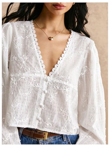 • Features: cute babydoll top for women fall spring, lace-trimmed neckine, v neck, long sleeve, cropped, sheer, buttons front, boho blouse shirt, floral embroidery, dressy going out top