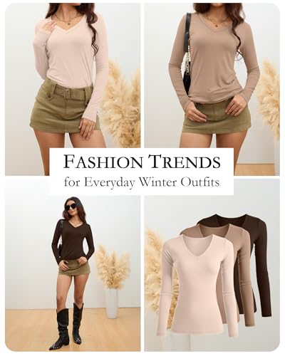 Ficerd 3 Pack Women's Long Sleeve Shirts, Cotton V Neck Basic Tees Slim Fit Casual Fall Tops Going Out Blouses T Shirts 6