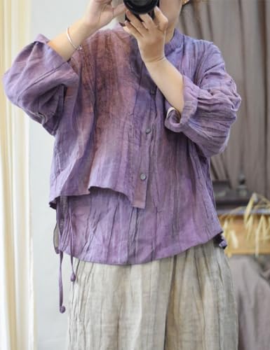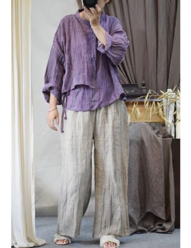 NFYM Women's Linen Asymmetrical Shirt Top Irregular Hem Tie Retro Stand Collar Button Blouse Shirts 7