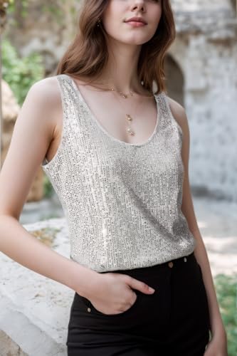 HOT ! Sequin Sleeveless Tank Tops for Women, Scoop Neck Womens Silver Sparkly top