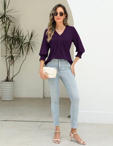 AKEWEI 3/4 Length Sleeve Womens Tops Summer Fashion V Neck Business Casual Blouses Smocked Shirts 5