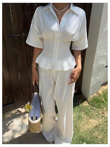 Milumia Women's Collar Button Down Short Sleeve Peplum Blouse Smocked Cinched Waist Top 1