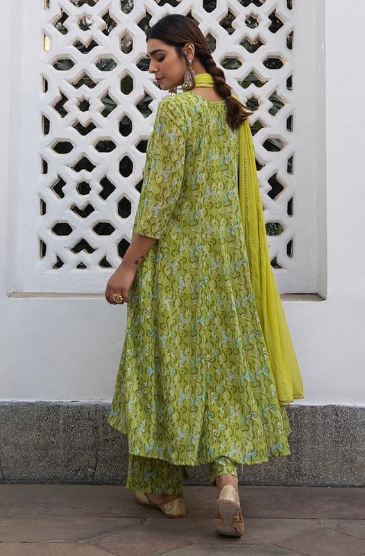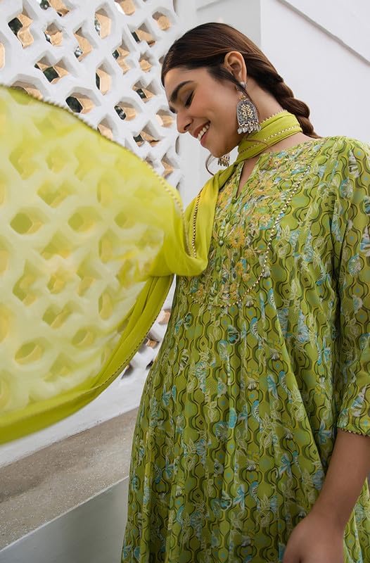 • [Features] Festive Spring-Summer Set for Women, regular quarter sleeves, Printed with Yoke Embroidery and Lace detail, Georgette Kurta, Straight Palazzo, and dupatta set, Lime green hue, 3-piece Style.
