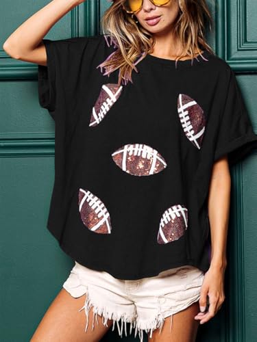 HOT ! Womens Sparkle Football Sequin Rugby Tee Game Day Pullover T-Shirt Crewneck Oversized Short Sleeve Washed Tops