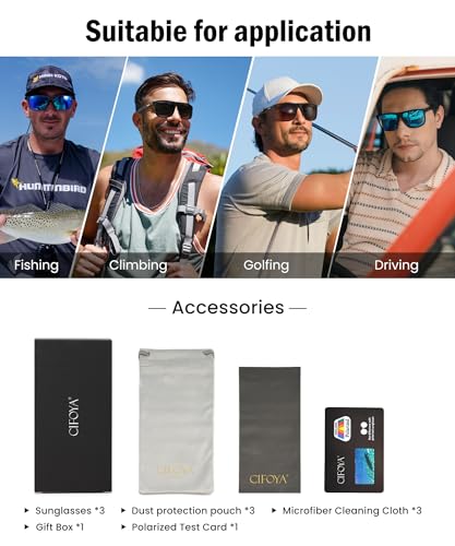 • Cost-Effective: CIFOYA polarized sunglasses are made of premium materials, including a elastic and lightweight frames, flexible hinges that makes it more scratch-resistant, durable. Experience high quality at an affordable price with the sunglasses for men. These mens polarized sunglasses protect your eyes from long-term UV damage