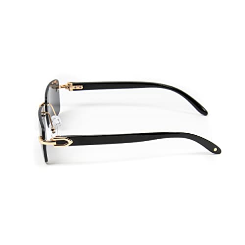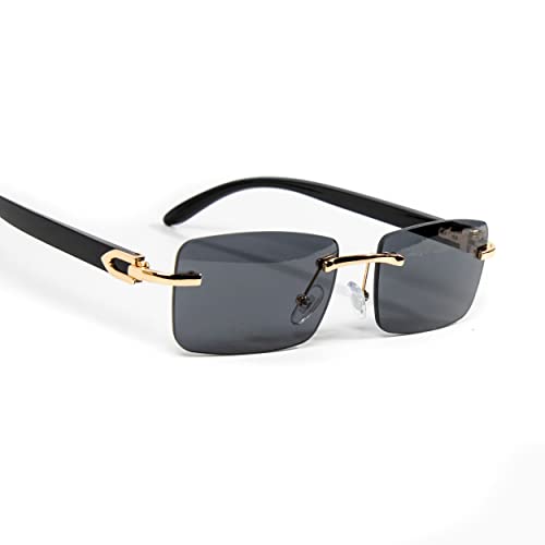 • Woodgrain Arms & Rimless Black Tint Lens: Designed with rimless black tint lenses and stylish woodgrain arms, these sunglasses men pair perfectly with any outfit, adding a touch of sophistication to your look.Woodgrain Arms & Rimless Black Tint Lens: Designed with rimless black tint lenses and stylish woodgrain arms, these sunglasses men pair perfectly with any outfit, adding a touch of sophistication to your look.